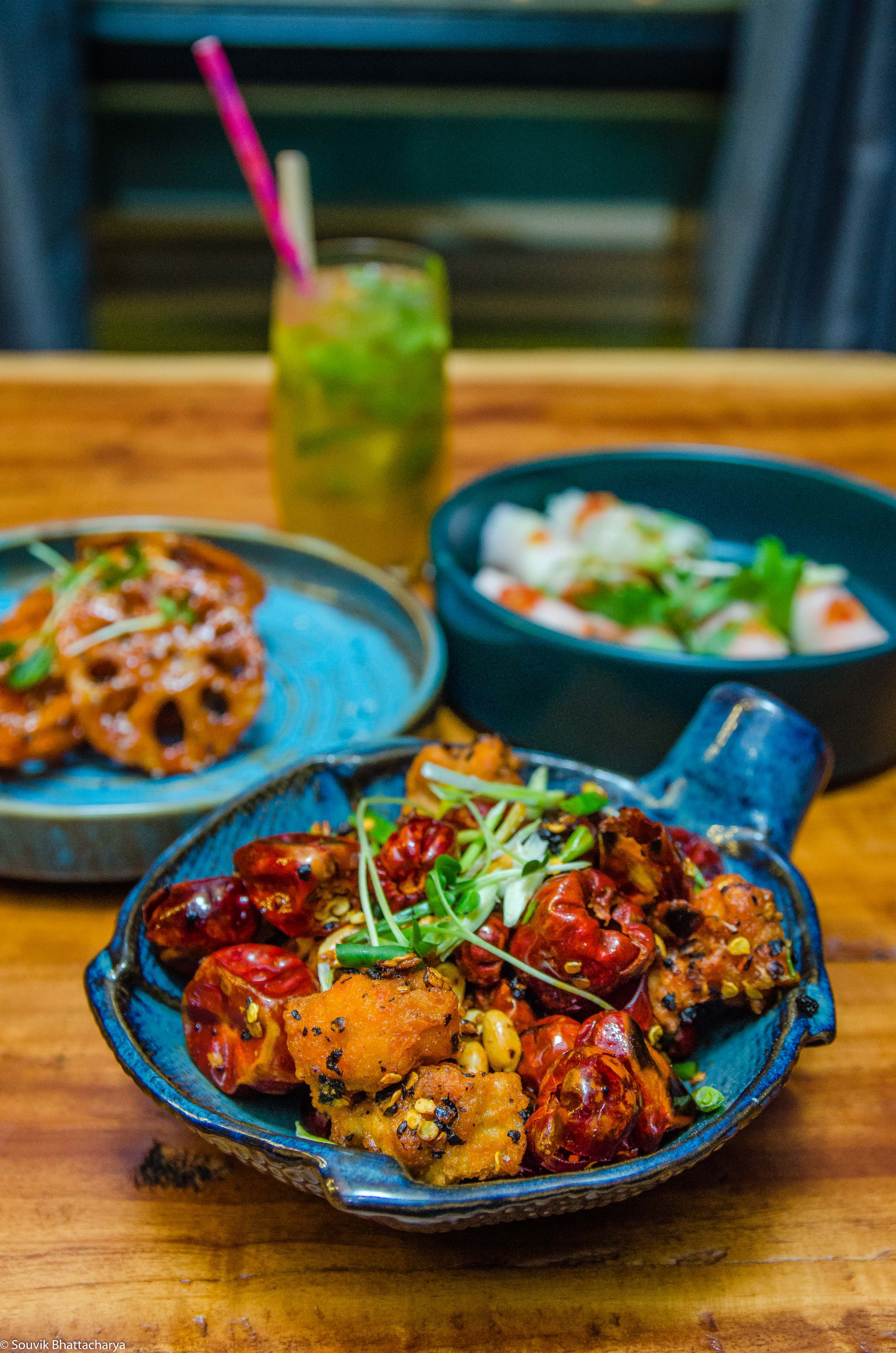 Another instant hit was Beijing Express Whistling Chicken. Crunchy nuggets of chicken and served with hot smoky chilis and beans. Not sure why is this called Beijing Express, guess in express speed one will wipe off the plate. In their dim sums we were served with Gold Dusted Dark & Handsome Chicken Dim Sum. The coal black dumplings dragged everyone’s attention on table. The black colour is achieved with dehydrated beetroots and wheat starch and the dim sums were garnished with 24 carat gold dust. The chicken dumpling shall be enjoyed with chili oil.